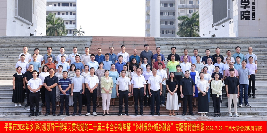 7月28日,平果市2025年乡(科)级领导干部学习贯彻党的二十届三中全会精神暨“乡村振兴+城乡融合”专题研讨班在我校开班。中共平果市委组织部副部长、市老干部局局长(兼)阮俊杰,广西大学万象城网页版干部培训中心主任黎耀凡出席开班式并讲话。